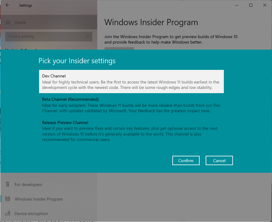 - Under the “Pick your Insider settings” option, choose “Dev Channel” button and select Confirm.