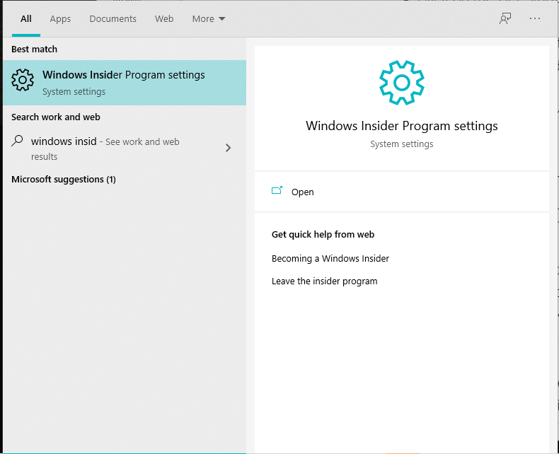 - Search in the Windows search for “Windows Insider” and open “Windows Insider Program settings”