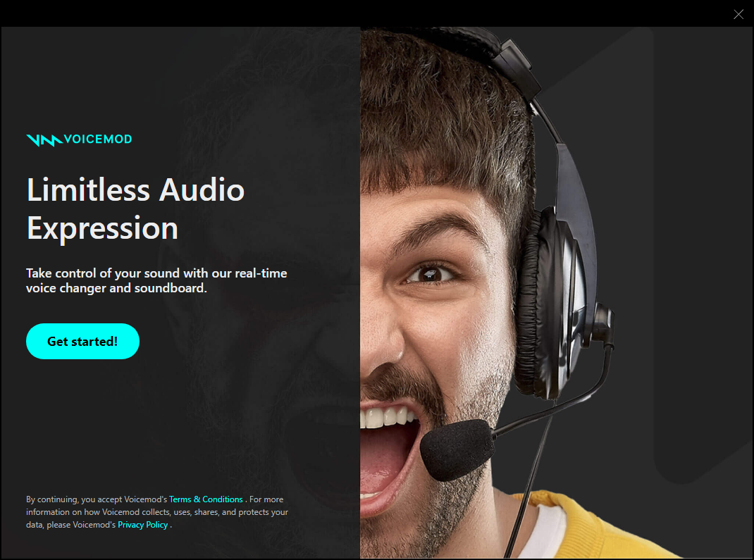 - Click the Get Started! button. This will activate your Voicemod account and will redirect you to your internet browser. Once this completes, you can head back to your Voicemod application.