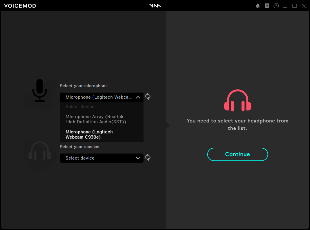 - Select the microphone and speaker you want to use with Voicemod. Selecting them will provide you audio feedback.