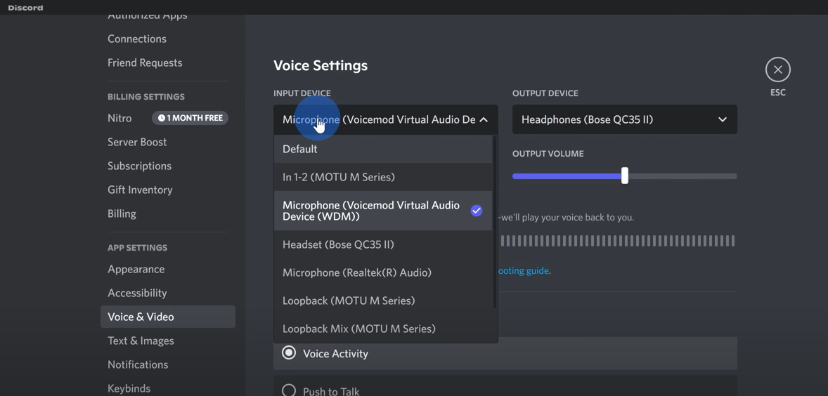 - Change the Input Device to “Microphone (Voicemod Virtual Audio Device (WDM))”